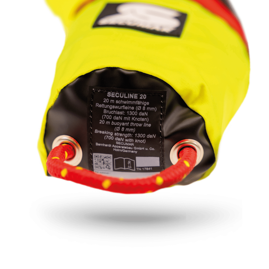 Die schwimmfähige Leine selbst ist 20 Meter lang und mit stabilen Schlaufen ausgestattet. Mit einem Durchmesser von 8 mm liegt sie gut in der Hand, ohne an Flexibilität einzubüßen. Ihre Bruchlast beträgt 1300 daN – mit Knoten etwa 700 daN – und garantiert damit hohe Sicherheit und Belastbarkeit im Ernstfall.